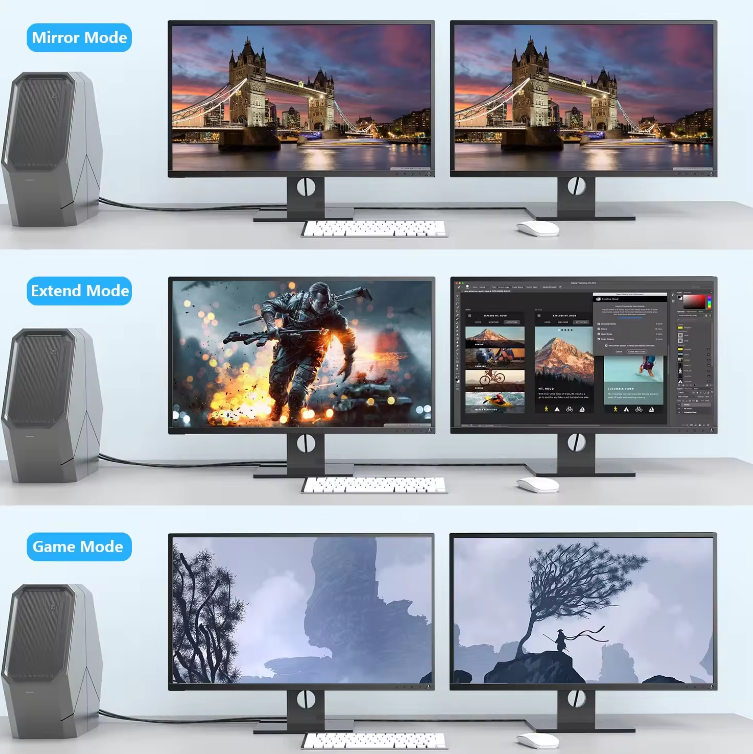- Modul extins - utilizarea unui ecran extern ca desktop suplimentar care poate conține conținut suplimentar.