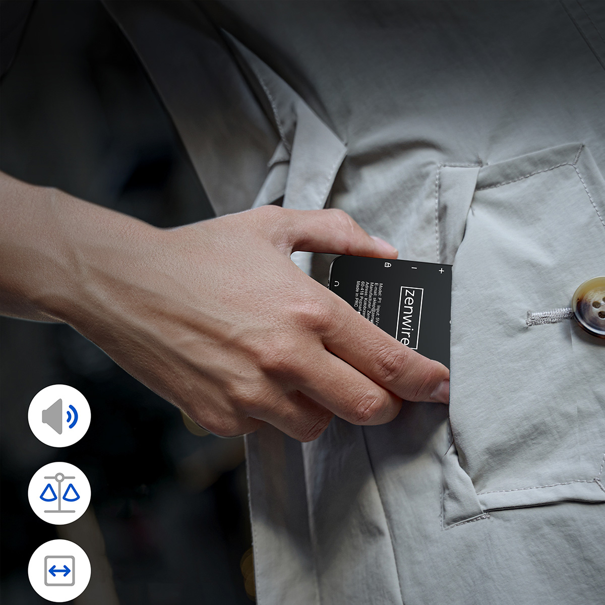 Playerul Zenwire MP3/MP4 cântărește doar 80 g, iar dimensiunile sale subțiri (75 × 52 × 12 mm) fac ca acesta să încapă fără probleme în buzunar, geantă sau rucsac.