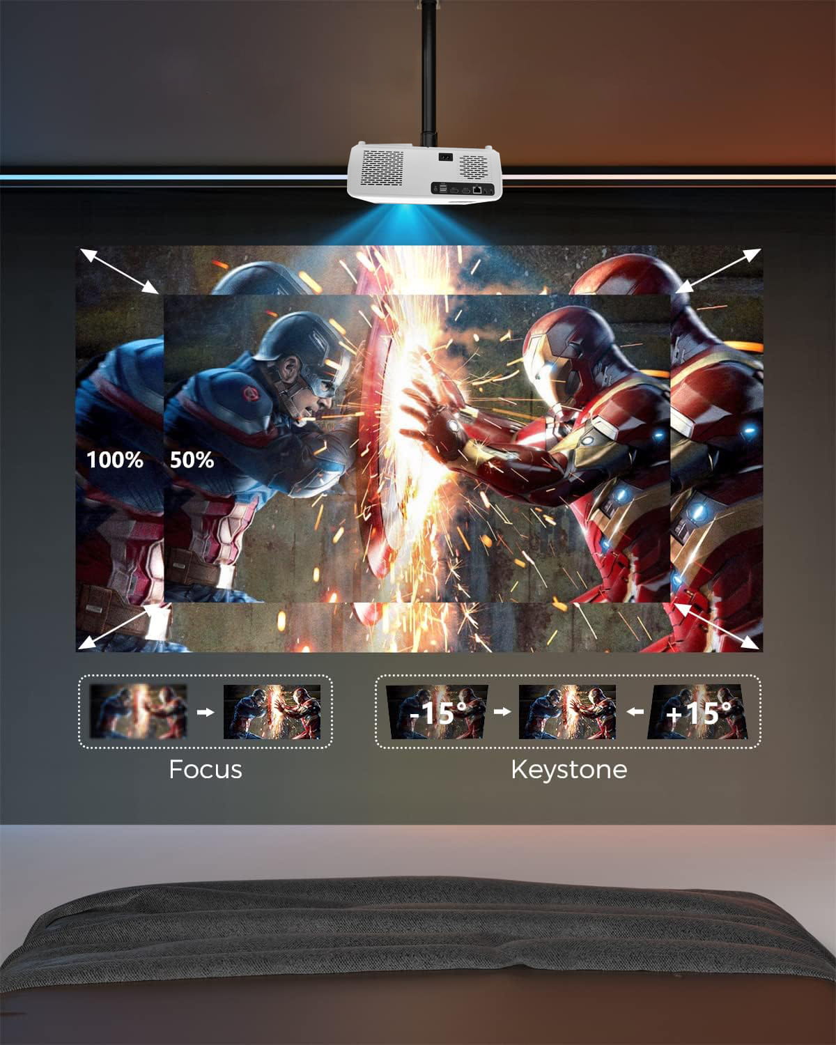 Reduceți dimensiunea imaginii după cum este necesar pentru a se potrivi cu peretele dumneavoastră. Garantând cea mai bună experiență audiovizuală posibilă.