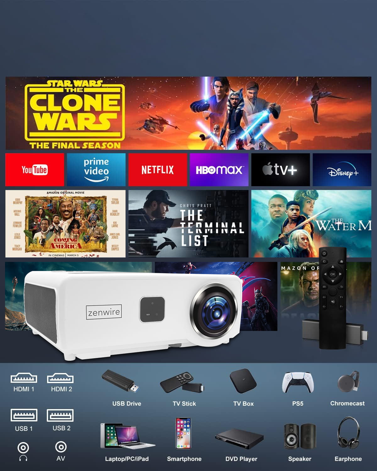 ✅ Proiector Zenwire e660h cu ANDROID SMART TV cu acces la aplicații populare precum Netflix, Youtube, Prime Video, HBO GO, Spotify, Disney+ și multe altele! Redă-ți filmele preferate direct pe proiector, fără a fi nevoie de dispozitive suplimentare!