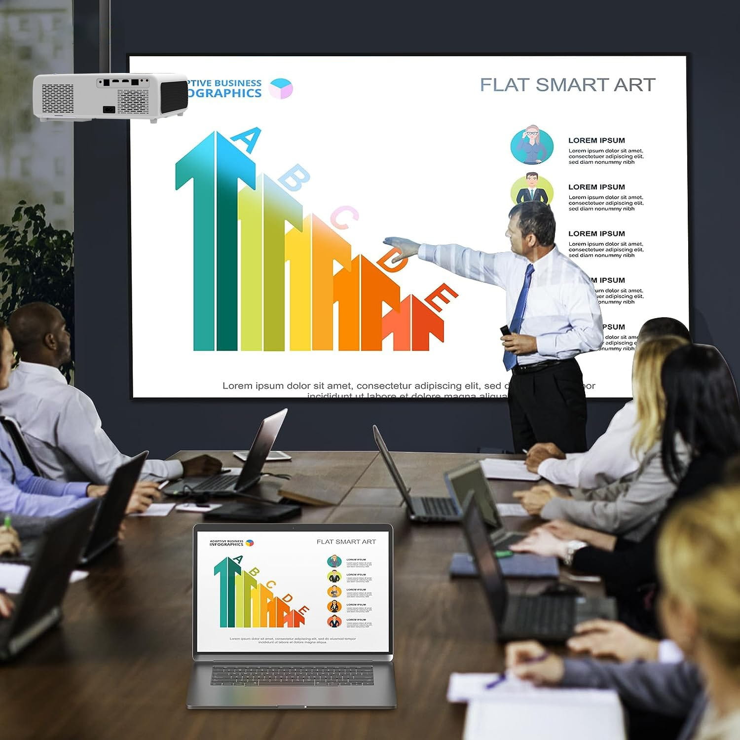 ✅ Confort de utilizare și reglabilitate nelimitată - Autofocus - focalizare automată - focalizare automată în câteva secunde, corecție automată pe verticală și orizontală ( Autokeystone 4D), Funcția ZOOM posibilitatea de a reduce imaginea pentru a se potrivi peretelui, Proiectorul poate proiecta o imagine dreaptă chiar și stând lateral față de perete(Proiecție laterală), Funcția 360 - posibilitate de rotație la 360 de grade, proiecție spate.